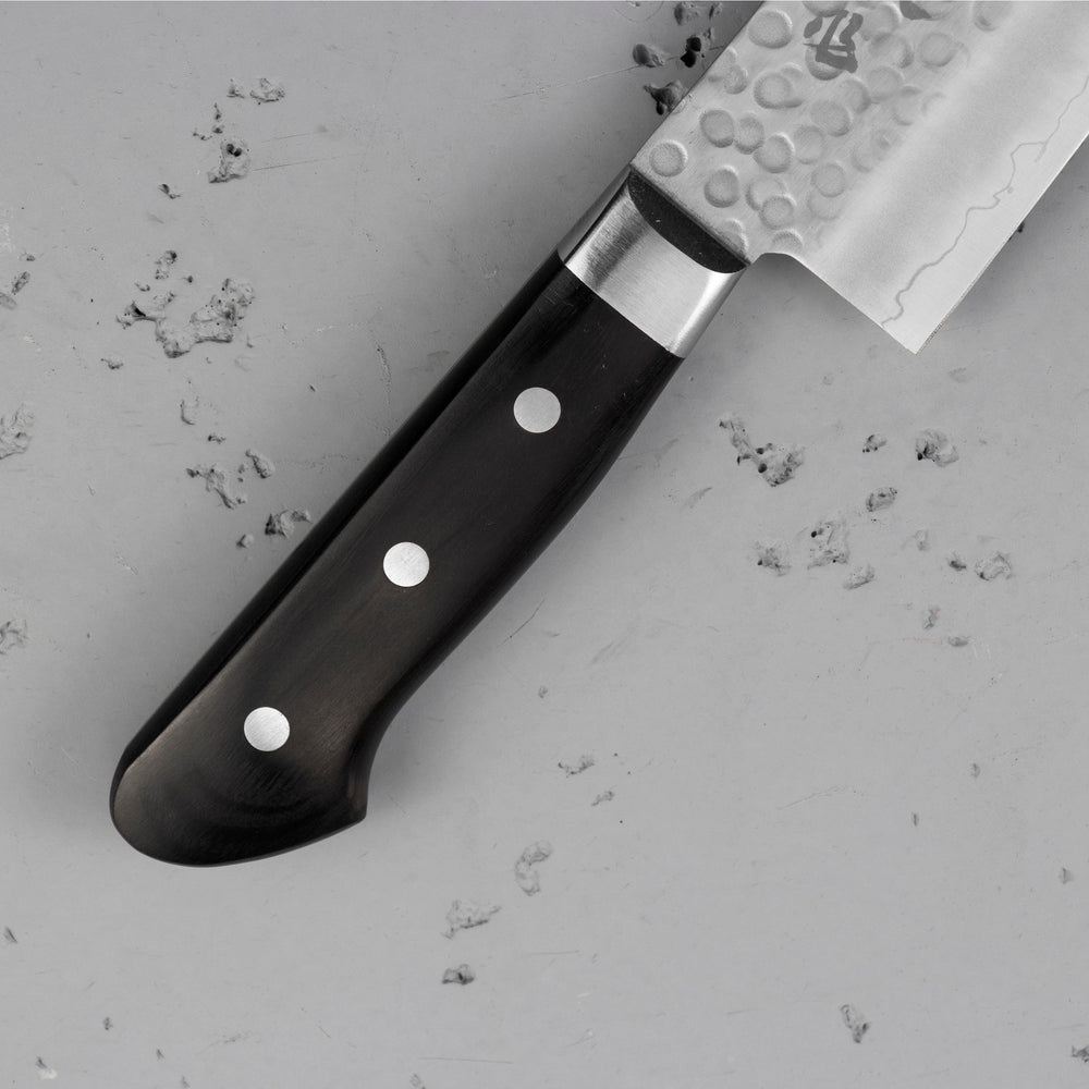 Sandvik 19C27 is a very pure alloy. This steel is designed for industrial blades for cutting heavy-duty cardboard and thick textile materials. By knife manufacturers it is referred to as the precursor or budget version of the widely known VG 10. This steel is also often used and praised by Japanese manufacturers such as Fujitora / Tojiro, Kumadori and Suisin. This steel is characterized by a high hardness of 62-64 HRC. In addition to it, the alloy is also known for its enormous world-class wear resistance thanks to its coarse grain structure. Appropriate heat treatment of Japanese masters guarantees optimal austenite content (15%) and even distribution of carbides. This results in a perfect balance of hardness, wear resistance, ductility and remarkable corrosion resistance. Due to their microstructure, steel products can be difficult to sharpen (small edge angles and limited stability). Sandvik 19C27 has a high resistance to corrosion, but is not completely resistant to it, knives made of this steel should not cause problems in everyday use. However, you should remember to keep them clean and periodically protect them.