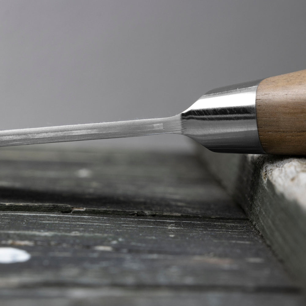 Carbon steel requires much more care than stainless steels. The basic principle of the maintenance of carbon steel knives is to wipe them dry, leaving a dirty knife even for a moment will quickly cover it with a patina. After wiping the knife dry, it is best to lubricate it with a small amount of camellia oil, which will additionally protect the blade. Leaving a wet knife to dry on its own will result in the appearance of small spots of rust. It is completely unacceptable to wash the knives in a dishwasher, chemicals and high temperature will negatively affect the handle and the blade, it can also lead to permanent damage to the knife. The knife is used only for cutting soft, boned and non-frozen products. If the blade comes into contact with the bone, it can chip. When cutting, do not twist the knife from side to side, as it may break the tip if the knife is jammed in the product. The wood and plastic boards recommended by us, cutting on glass or stone boards is prohibited, it will lead to an accelerated process of blunting the knife and possible nicks. The knife should only be used as a cutting tool, the thin, sharp design perfectly cuts the products, but when you try to open the jars, the blade may chip.