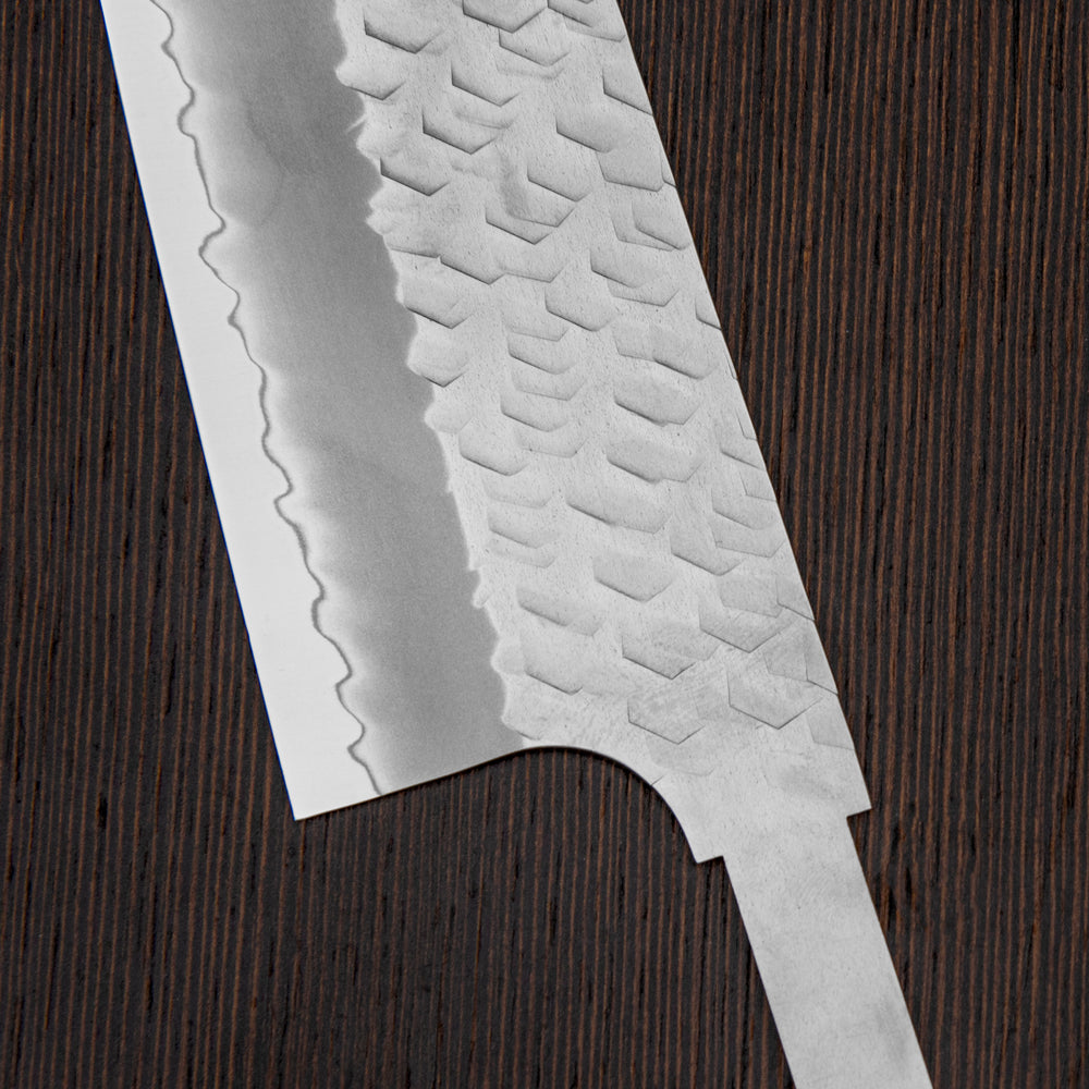R2 and SG2 steels are basically the same steels, sold under different names. R2 steel is distributed by one of the leaders in Japanese steel production, namely Kobelco Steel Company. This steel is also purchased by Takefu Steel Company which labels it as SG2 (according to Koki Iwahara of JapaneseChefsKnife.Com). This steel is powder-coated, high-speed steel. Thanks to the unique production process, this steel has a very high degree of purity, precisely selected chemical composition and an intricately designed structure. It has an outstanding sharpness at the level of 64 HRC, it is harder than most powder steels, thanks to the significant share of molybdenum and vanadium forming carbides. A significant amount of vanadium, in addition to improving the hardness and abrasion resistance of steel, does not reduce plastic properties, and even improves impact strength and elasticity. The very high content of molybdenum, improving the strength properties, together with chromium also affects the corrosion resistance of this steel. R2 / SG2 keeps sharpness for a very long time. In addition, it is maintenance-free, with excellent blades, even better than the iconic ZDP-189. This steel is ideal for professionals who have the highest demands on their tools.