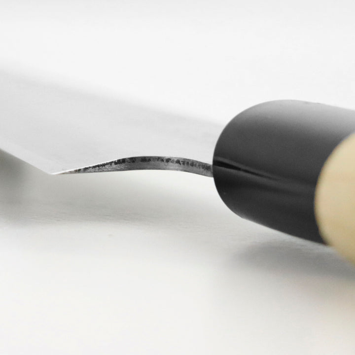 Carbon steel requires much more care than stainless steels. The basic principle of the maintenance of carbon steel knives is to wipe them dry, leaving a dirty knife even for a moment will quickly cover it with a patina. After wiping the knife dry, it is best to lubricate it with a small amount of camellia oil, which will additionally protect the blade. Leaving a wet knife to dry on its own will result in the appearance of small spots of rust. It is completely unacceptable to wash the knives in a dishwasher, chemicals and high temperature will negatively affect the handle and the blade, it can also lead to permanent damage to the knife. The knife is used only for cutting soft, boned and non-frozen products. If the blade comes into contact with the bone, it can chip. When cutting, do not twist the knife from side to side, as it may break the tip if the knife is jammed in the product. The wood and plastic boards recommended by us, cutting on glass or stone boards is prohibited, it will lead to an accelerated process of blunting the knife and possible nicks. The knife should only be used as a cutting tool, the thin, sharp design perfectly cuts the products, but when you try to open the jars, the blade may chip.