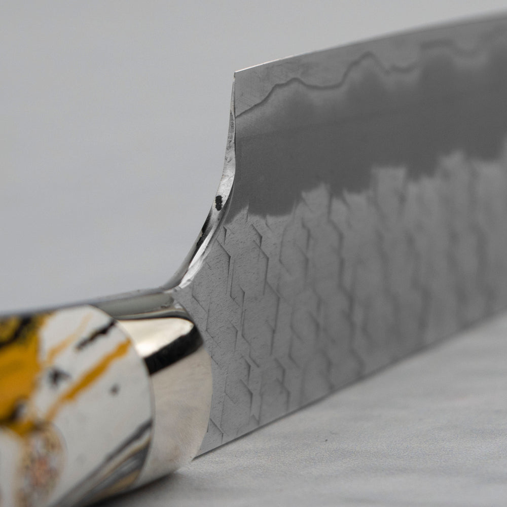 R2 and SG2 steels are basically the same steels, sold under different names. R2 steel is distributed by one of the leaders in Japanese steel production, namely Kobelco Steel Company. This steel is also purchased by Takefu Steel Company which labels it as SG2 (according to Koki Iwahara of JapaneseChefsKnife.Com). This steel is powder-coated, high-speed steel. Thanks to the unique production process, this steel has a very high degree of purity, precisely selected chemical composition and an intricately designed structure. It has an outstanding sharpness at the level of 64 HRC, it is harder than most powder steels, thanks to the significant share of molybdenum and vanadium forming carbides. A significant amount of vanadium, in addition to improving the hardness and abrasion resistance of steel, does not reduce plastic properties, and even improves impact strength and elasticity. The very high content of molybdenum, improving the strength properties, together with chromium also affects the corrosion resistance of this steel. R2 / SG2 keeps sharpness for a very long time. In addition, it is maintenance-free, with excellent blades, even better than the iconic ZDP-189. This steel is ideal for professionals who have the highest demands on their tools.