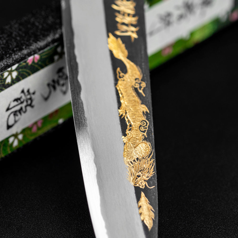 The knives are hand-forged and decorated, and their distinctive Kurouchi-type finish emphasizes the traditional, artisanal process of their creation. Each knife is created through the work of many experienced artisans, which gives it a unique character.