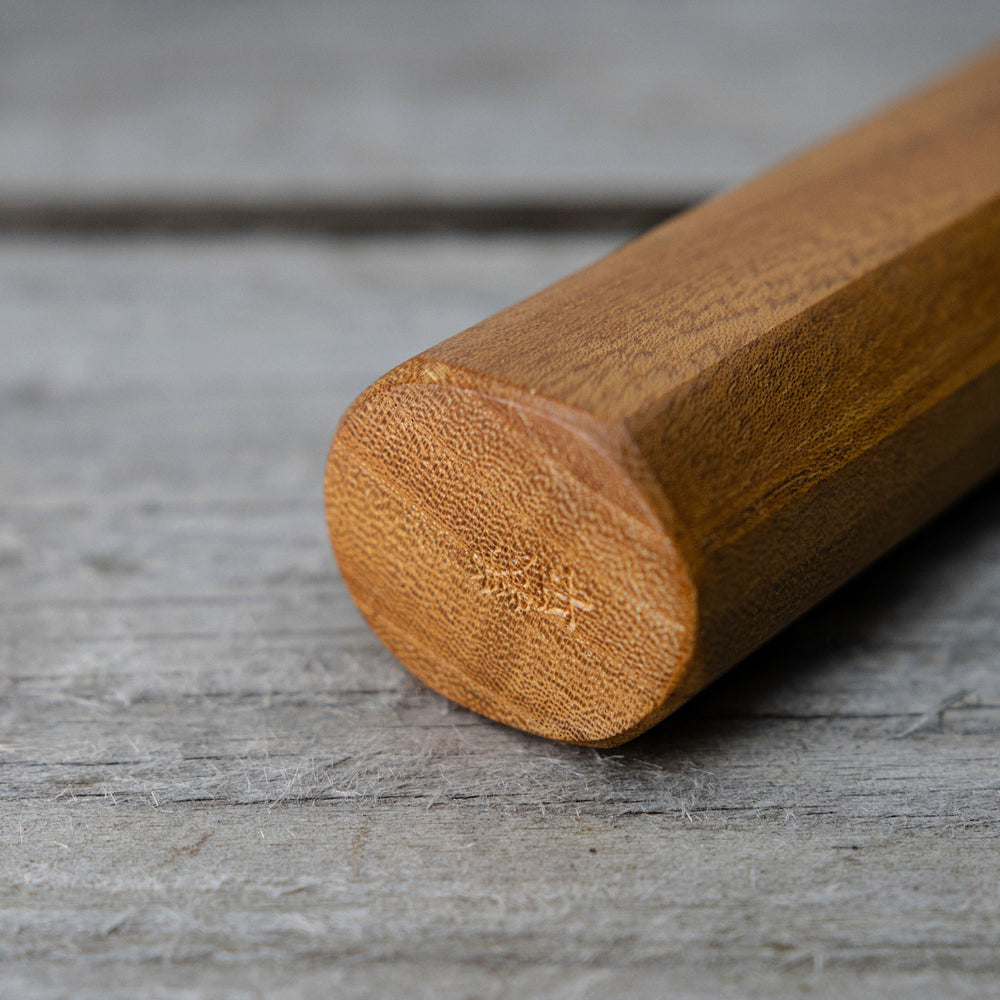 Carbon steel requires much more care than stainless steels. The basic principle of the maintenance of carbon steel knives is to wipe them dry, leaving a dirty knife even for a moment will quickly cover it with a patina. After wiping the knife dry, it is best to lubricate it with a small amount of camellia oil, which will additionally protect the blade. Leaving a wet knife to dry on its own will result in the appearance of small spots of rust. It is completely unacceptable to wash the knives in a dishwasher, chemicals and high temperature will negatively affect the handle and the blade, it can also lead to permanent damage to the knife. The knife is used only for cutting soft, boned and non-frozen products. If the blade comes into contact with the bone, it can chip. When cutting, do not twist the knife from side to side, as it may break the tip if the knife is jammed in the product. The wood and plastic boards recommended by us, cutting on glass or stone boards is prohibited, it will lead to an accelerated process of blunting the knife and possible nicks. The knife should only be used as a cutting tool, the thin, sharp design perfectly cuts the products, but when you try to open the jars, the blade may chip.