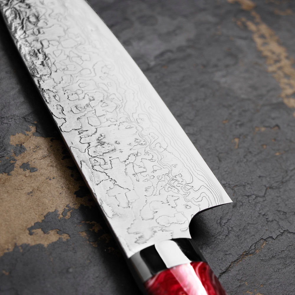 R2 and SG2 steels are basically the same steels, sold under different names. R2 steel is distributed by one of the leaders in Japanese steel production, namely Kobelco Steel Company. This steel is also purchased by Takefu Steel Company which labels it as SG2 (according to Koki Iwahara of JapaneseChefsKnife.Com). This steel is powder-coated, high-speed steel. Thanks to the unique production process, this steel has a very high degree of purity, precisely selected chemical composition and an intricately designed structure. It has an outstanding sharpness at the level of 64 HRC, it is harder than most powder steels, thanks to the significant share of molybdenum and vanadium forming carbides. A significant amount of vanadium, in addition to improving the hardness and abrasion resistance of steel, does not reduce plastic properties, and even improves impact strength and elasticity. The very high content of molybdenum, improving the strength properties, together with chromium also affects the corrosion resistance of this steel. R2 / SG2 keeps sharpness for a very long time. In addition, it is maintenance-free, with excellent blades, even better than the iconic ZDP-189. This steel is ideal for professionals who have the highest demands on their tools.