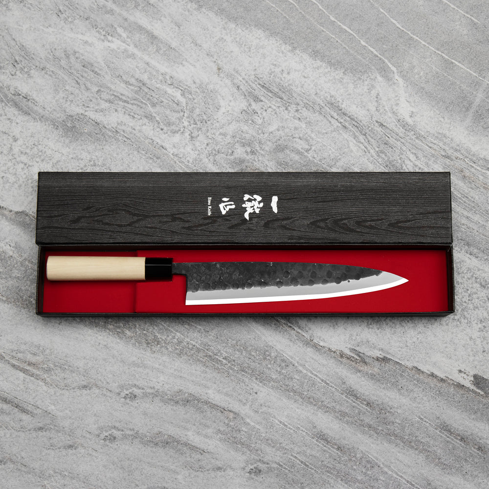 Carbon steel requires much more care than stainless steels. The basic principle of the maintenance of carbon steel knives is to wipe them dry, leaving a dirty knife even for a moment will quickly cover it with a patina. After wiping the knife dry, it is best to lubricate it with a small amount of camellia oil, which will additionally protect the blade. Leaving a wet knife to dry on its own will result in the appearance of small spots of rust. It is completely unacceptable to wash the knives in a dishwasher, chemicals and high temperature will negatively affect the handle and the blade, it can also lead to permanent damage to the knife. The knife is used only for cutting soft, boned and non-frozen products. If the blade comes into contact with the bone, it can chip. When cutting, do not twist the knife from side to side, as it may break the tip if the knife is jammed in the product. The wood and plastic boards recommended by us, cutting on glass or stone boards is prohibited, it will lead to an accelerated process of blunting the knife and possible nicks. The knife should only be used as a cutting tool, the thin, sharp design perfectly cuts the products, but when you try to open the jars, the blade may chip.