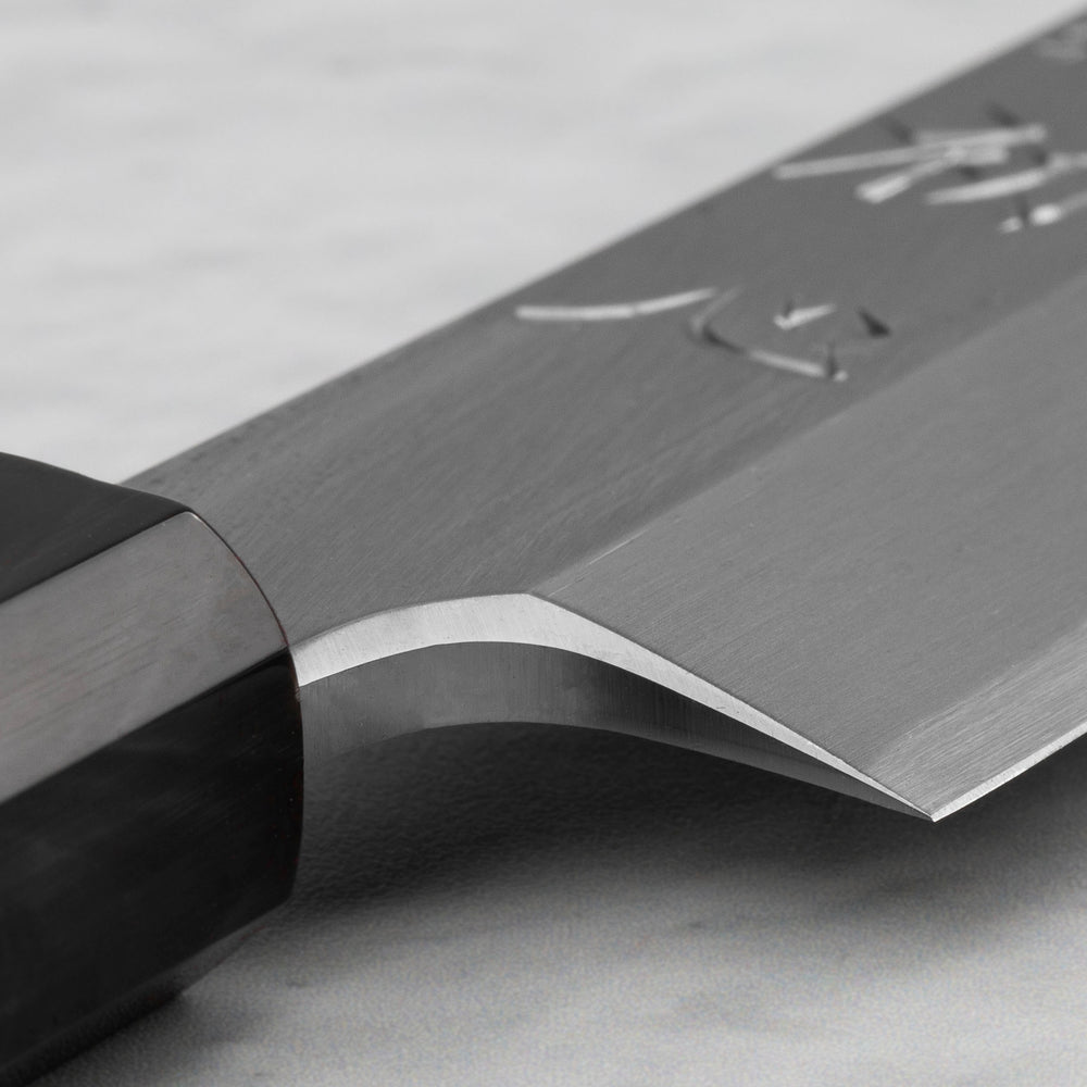 A less common design of the knife is the honyaki (hon-real, yaki-fire) where the whole knife is made of one piece of high-carbon steel which is selectively hardened, which is shown by the hamon (hardening line) on the sides of the knife. Usually, this type of knives is chosen by people who care about having not only a tool but a work of art that is one of a kind. Unfortunately, the price is also behind the uniqueness, because these types of knives are very difficult to manufacture and process for both the blacksmith and the sharpener who has to deal with much higher hardened steel than usual. Production rejects can range from 20 to 50%. During hardening the blades can bend and break. Selective hacking knives are divided into those that are cooled in oil - abure-yaki and in water - mizu-yaki. Knives of this type are traditionally made with shirogami or Aogami, but exceptionally you can come across a blade made of tamahagane steel. However, this type of knives are unique and you will probably not find them in any popular knife store also in Japan itself. The name honyaki is also used for knives constructed entirely of steel that are not selectively hardened. You can come across knives made of both very good steel, such as VG-10, and average steel, such as 440J.