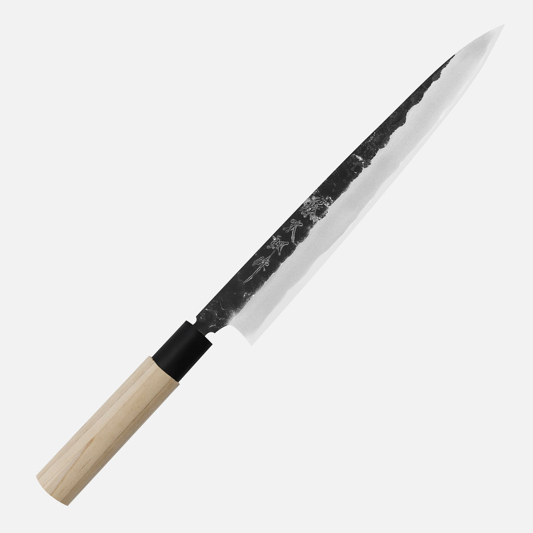 Yanagiba is one of the 3 basic knife shapes necessary in the cultivation of traditional Japanese washoku cuisine. The name itself freely translates to a willow blade, the shape of this knife refers to the shape of the leaf of this tree. The slender and delicate shape of the blade is designed to cut delicate raw fish meat, which makes this knife unrivaled. The most characteristic thing that defines the design of traditional knives is the concave back of the Urasuki knife that allows it to be sharpened again quickly and the widely marked path of the blade (kireha).