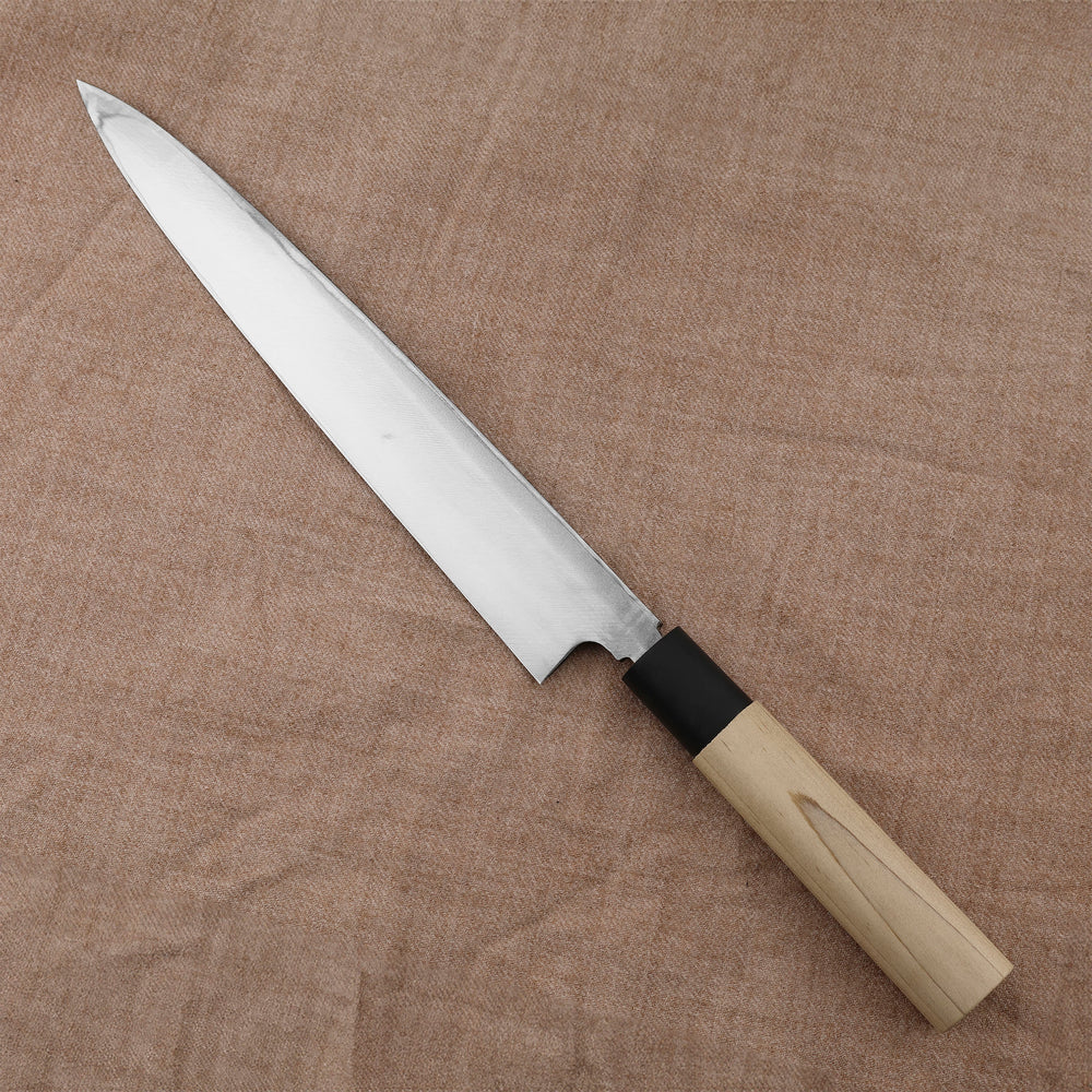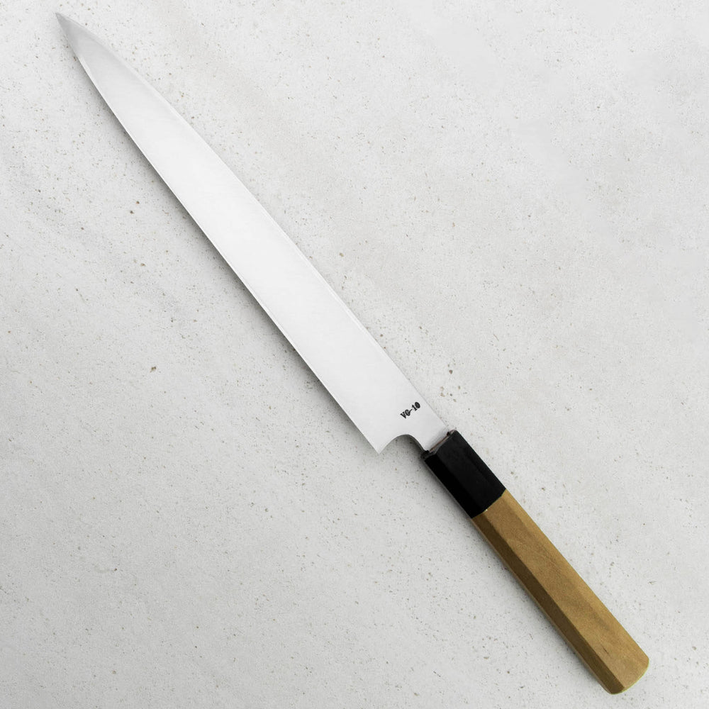 The length of the yanagiba's blade can vary from 21cm to even 36cm. The most common lengths are 24 and 27 centimeters, the length of which is best suited to the size of countertops in Japanese restaurants. Japanese knives usually only come pre-sharpened. Before use, it is necessary to open the knife (honbazuke), which will only allow you to get the necessary sharpness.