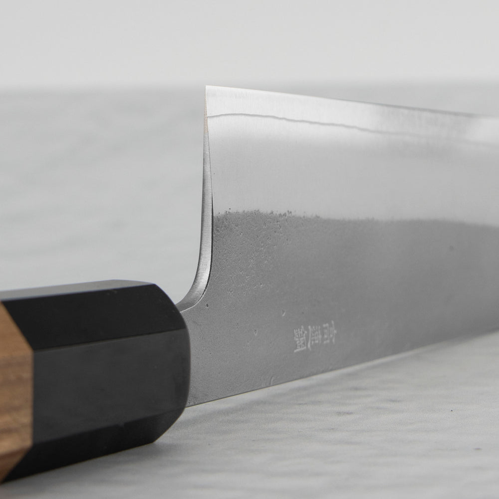 Carbon steel requires much more care than stainless steels. The basic principle of the maintenance of carbon steel knives is to wipe them dry, leaving a dirty knife even for a moment will quickly cover it with a patina. After wiping the knife dry, it is best to lubricate it with a small amount of camellia oil, which will additionally protect the blade. Leaving a wet knife to dry on its own will result in the appearance of small spots of rust. It is completely unacceptable to wash the knives in a dishwasher, chemicals and high temperature will negatively affect the handle and the blade, it can also lead to permanent damage to the knife. The knife is used only for cutting soft, boned and non-frozen products. If the blade comes into contact with the bone, it can chip. When cutting, do not twist the knife from side to side, as it may break the tip if the knife is jammed in the product. The wood and plastic boards recommended by us, cutting on glass or stone boards is prohibited, it will lead to an accelerated process of blunting the knife and possible nicks. The knife should only be used as a cutting tool, the thin, sharp design perfectly cuts the products, but when you try to open the jars, the blade may chip.