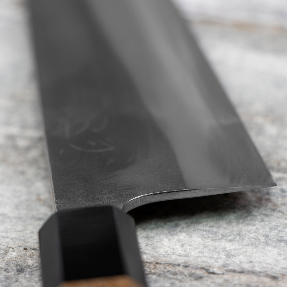 Carbon steel requires much more care than stainless steels. The basic principle of the maintenance of carbon steel knives is to wipe them dry, leaving a dirty knife even for a moment will quickly cover it with a patina. After wiping the knife dry, it is best to lubricate it with a small amount of camellia oil, which will additionally protect the blade. Leaving a wet knife to dry on its own will result in the appearance of small spots of rust. It is completely unacceptable to wash the knives in a dishwasher, chemicals and high temperature will negatively affect the handle and the blade, it can also lead to permanent damage to the knife. The knife is used only for cutting soft, boned and non-frozen products. If the blade comes into contact with the bone, it can chip. When cutting, do not twist the knife from side to side, as it may break the tip if the knife is jammed in the product. The wood and plastic boards recommended by us, cutting on glass or stone boards is prohibited, it will lead to an accelerated process of blunting the knife and possible nicks. The knife should only be used as a cutting tool, the thin, sharp design perfectly cuts the products, but when you try to open the jars, the blade may chip.