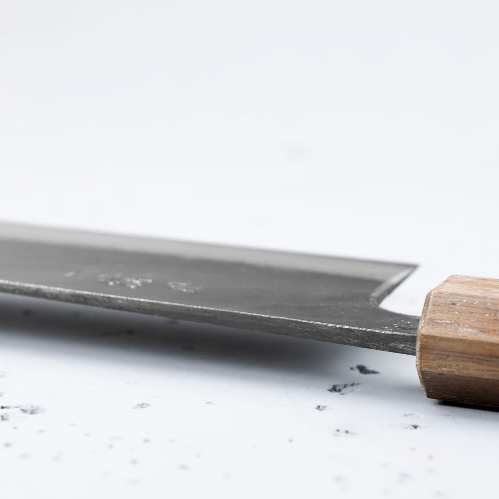 Carbon steel requires much more care than stainless steels. The basic principle of the maintenance of carbon steel knives is to wipe them dry, leaving a dirty knife even for a moment will quickly cover it with a patina. After wiping the knife dry, it is best to lubricate it with a small amount of camellia oil, which will additionally protect the blade. Leaving a wet knife to dry on its own will result in the appearance of small spots of rust. It is completely unacceptable to wash the knives in a dishwasher, chemicals and high temperature will negatively affect the handle and the blade, it can also lead to permanent damage to the knife. The knife is used only for cutting soft, boned and non-frozen products. If the blade comes into contact with the bone, it can chip. When cutting, do not twist the knife from side to side, as it may break the tip if the knife is jammed in the product. The wood and plastic boards recommended by us, cutting on glass or stone boards is prohibited, it will lead to an accelerated process of blunting the knife and possible nicks. The knife should only be used as a cutting tool, the thin, sharp design perfectly cuts the products, but when you try to open the jars, the blade may chip.