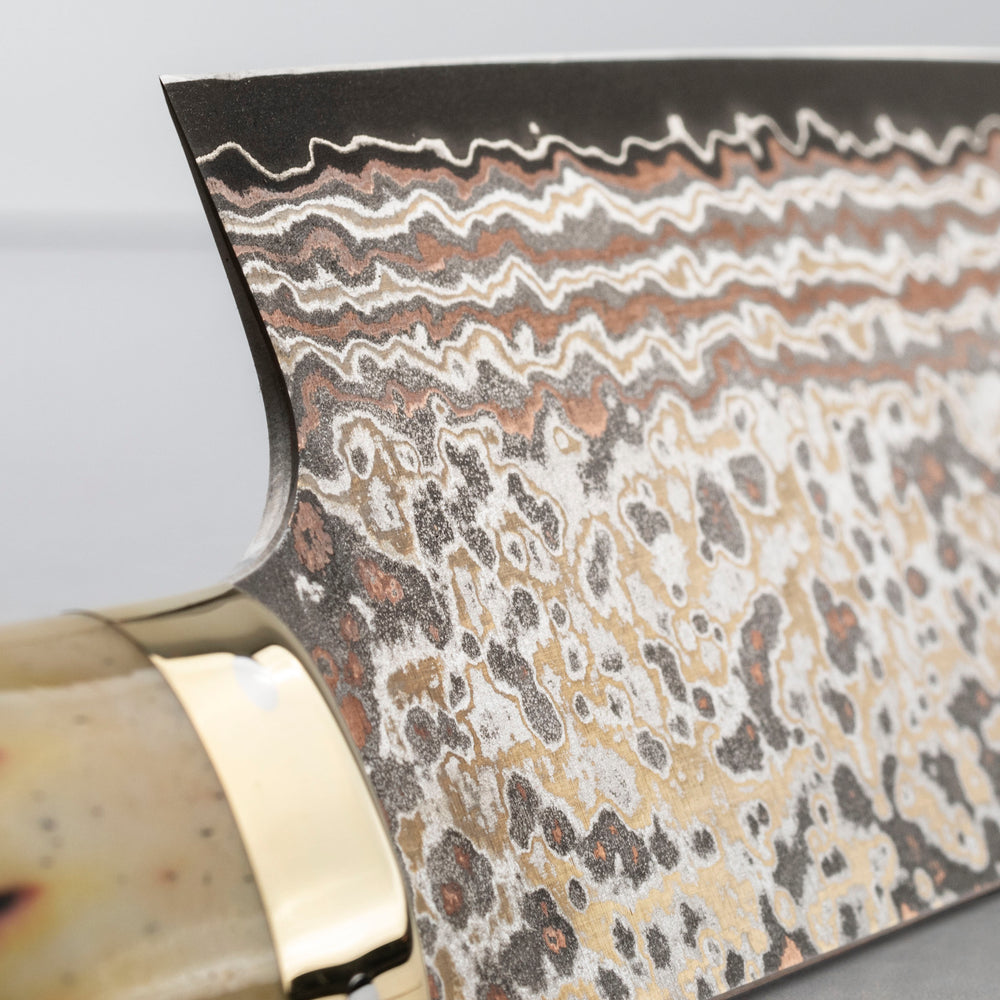 • Blade Steel Type: Stainless Steel VG-10 (Core) enveloped by stainless steel, brass and copper
